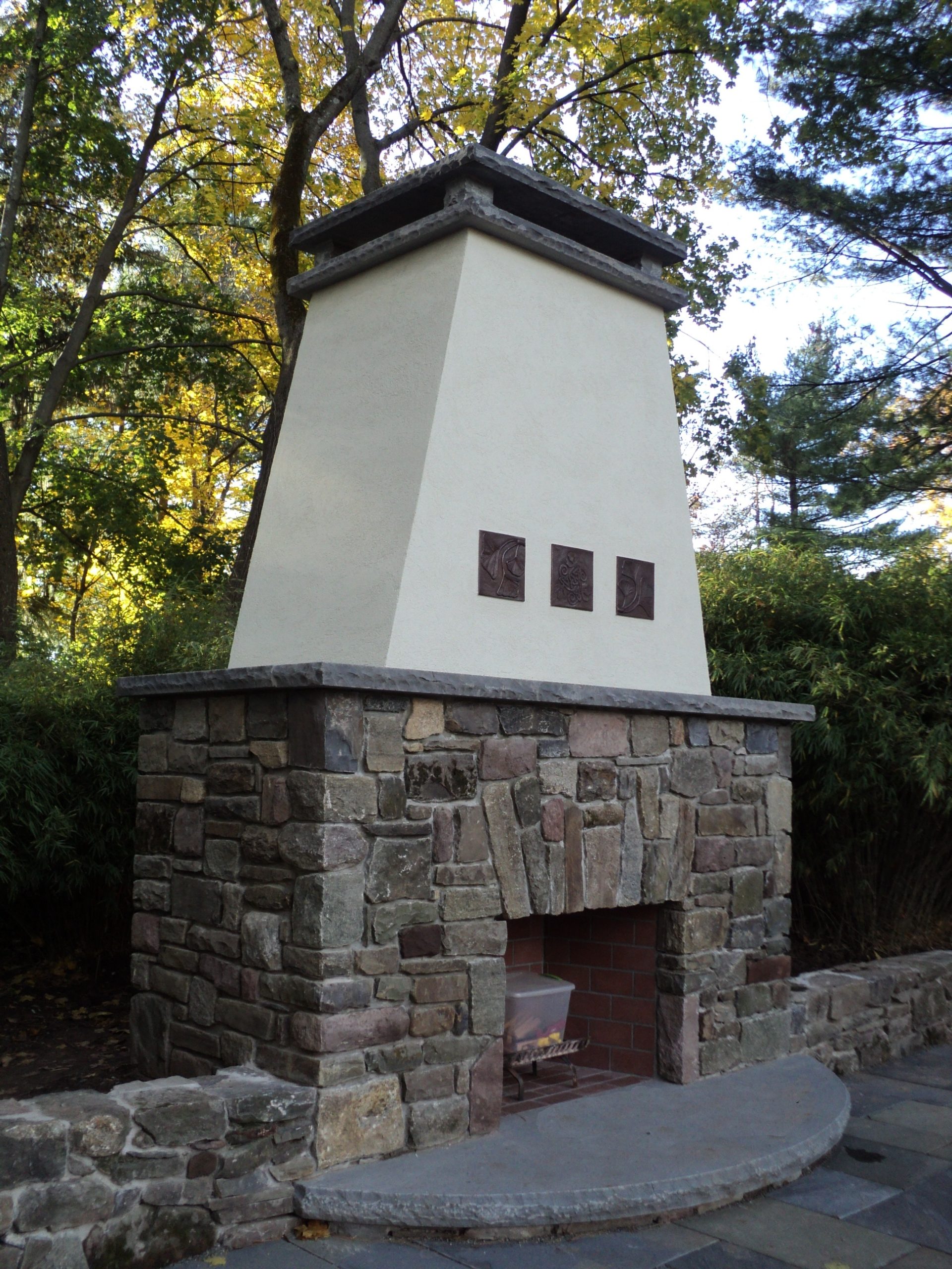 We wanted this fireplace to match the Tudor style of the existing home. The color of the stucco and stone matches those same materials located on the house. The custom copper medallions repeat elements found inside the home’s furnishings. The large bluestone hearth is similar in scale and texture (we rock-faced the edge) to large stones we found at the existing patio off the back of the house.