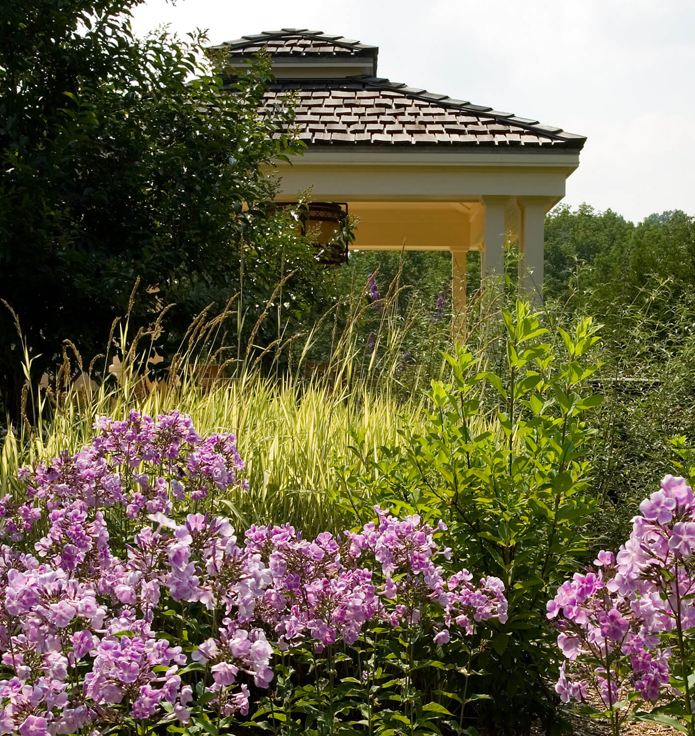 Toward the top of the knoll, the drive transitions to an open granite courtyard bordered by low stone walls. London plane trees and crabapples are located at the perimeter of the wall and low perennials and groundcovers take up the space below. A stone pathway brings visitors from the courtyard around to the pool and reflecting pond at the rear of the property.